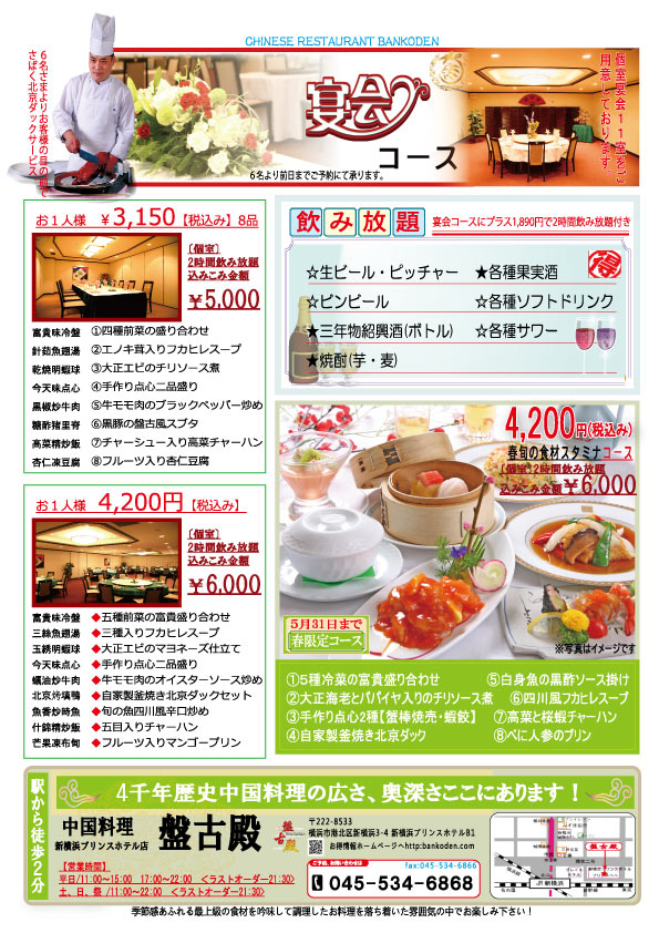 3月1日より『春の宴コース』開催いたします!!季節限定の宴会コースとなります。皆様のご来店心よりお待ちしております。 春の宴会コースメニュー 春旬の食材スタミナ 4000コース 定番の季節限定コース! 8品 飲み放題込:6,000円/人(税込) 料理のみ:4,200円/人(税込) メニューの詳細はこちら 春の美味づくしおすすめ 5000コース 北京ダックがセットになっておススメ! 9品 飲み放題込:7,000円/人(税込) 料理のみ:5,250円/人(税込) メニューの詳細はこちら フカヒレ一人一枚!美味贅沢! 6000円コース フカヒレと北京ダックが味わえる! 9品 飲み放題込:8,000円/人(税込) 料理のみ:6,300円/人(税込) メニューの詳細はこちら