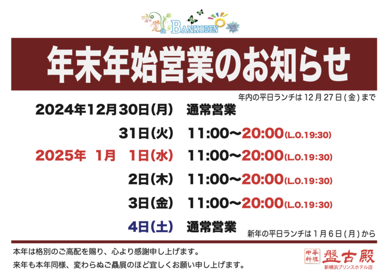 2024年12月31日(火)〜新年1月3日(金)は特別営業のため閉店時間が異なります