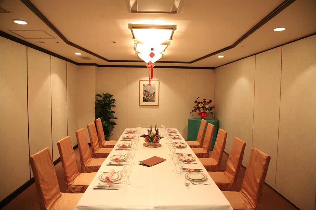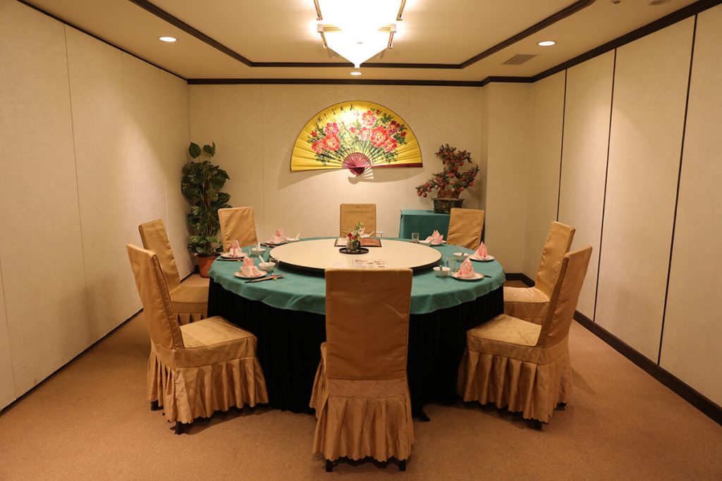 盤古殿の個室は、歓送迎会などに最適な円卓と、接待、顔合わせなどに最適な向い合わせの長い卓の2種類をご用意させていただいております。長卓は、最上級の高級な一本木を利用しておりますので、大切なご歓談の場として最適なお席となります。